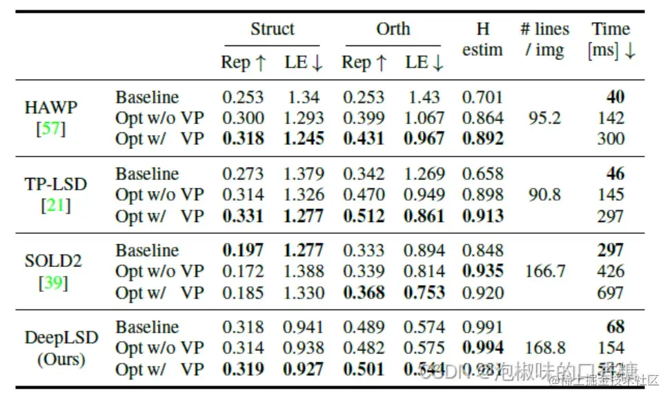 作者还研究了优化步骤的影响。对于每种方法,作者将原始线条与优化后的线条和VP进行比较。表3展示了线检测器在Wireframe测试集的462张图像上的检测结果。结果显示,优化可以显著改善不精确方法的定位误差和单应性得分,并显著提高评价直线精度的所有指标。特别是对于HAWP和TP-LSD,两者的定位误差都下降了32 %,单应性得分提高了27 %和39 %。注意,优化并没有给DeepLSD带来多大提升,这是因为它的原始预测线已经是亚像素精确的,并且优化受到DF和AF分辨率的限制。