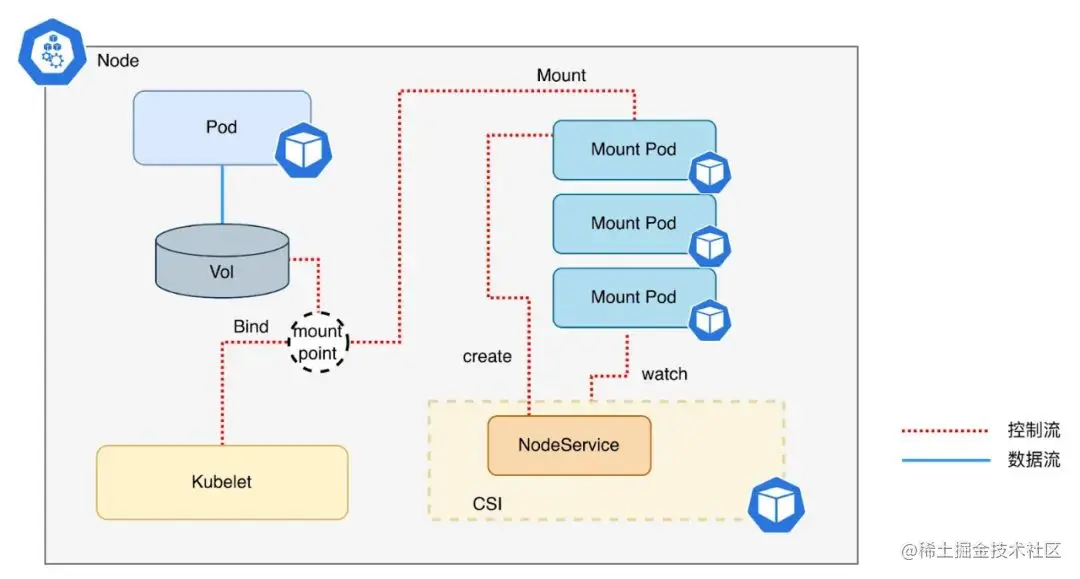 - Node Service:创建 Mount Pod(JuiceFS 客户端),并挂载应用 Pod。下文会详细介绍其工作机制。