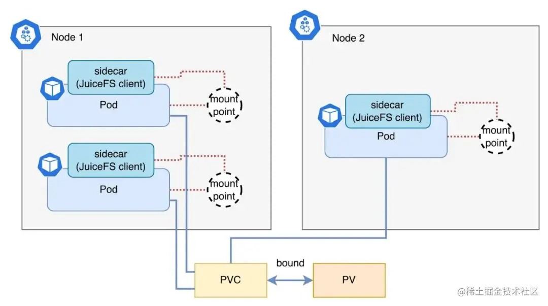 近期发布的 JuiceFS CSI Driver v0.18 版本中,我们提供了一种全新的方式访问文件系统,即 JuiceFS 客户端以 Sidecar 方式运行于应用 Pod 中,且客户端与应用同生命周期。