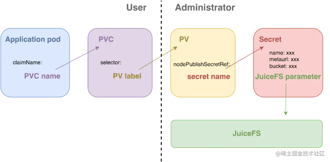动态配置 由系统管理员创建 StorageClass,在 StorageClass 中声明包含了 JuiceFS 系统参数的 Secret;然后用户创建 PVC,声明使用具体的 StorageClass,PVC 创建之后,Kubernetes 会根据 StorageClass 自动创建出一个 PV 与 PVC 进行绑定,最后用户在应用 Pod 中配置使用 PVC。
