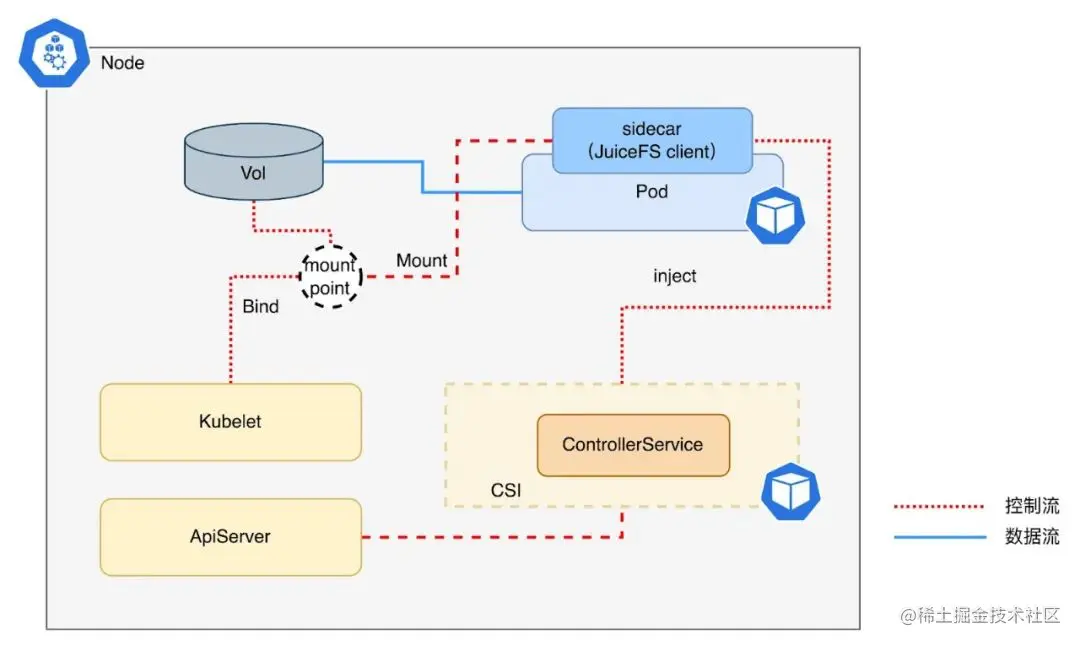 - CSI Controller 向应用 Pod 中注入 JuiceFS 客户端容器(sidecar);