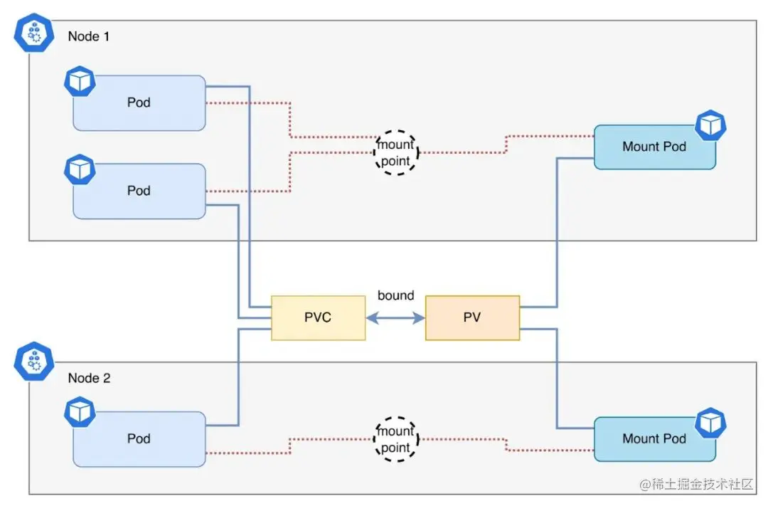 PVC 与 Mount Pod 的关系 PVC、PV 和 Pod 的关系可以用下图表示,即在同一个节点上,一个 PVC 会对应一个 Mount Pod。