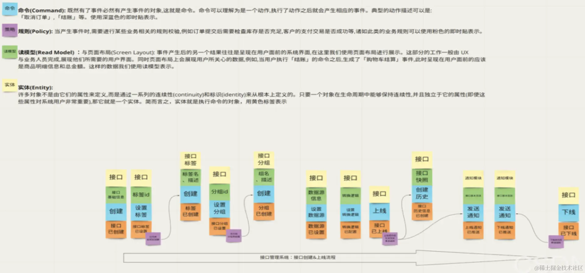 - 领域对象 即实体/聚合。这里的领域对象并非数据库模型, 而是与业务紧密联系的“对象”。因为事件风暴是一种面向对象的建模方式, 而不是面向数据库的建模方式。