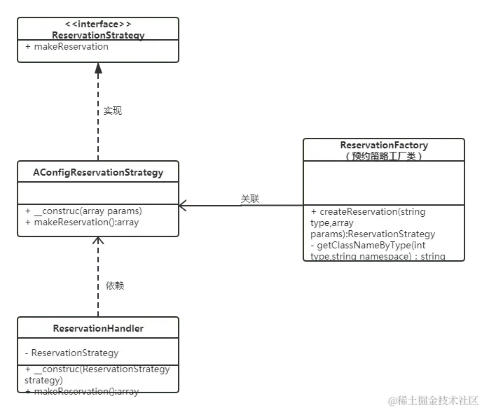 以上代码使用了工厂模式以及策略模式的结合,其中ReservationHandler类作为处理上下文的类,通过依赖注入相应的策略类,直接调用makeReservation方法。在客户端代码只需要调用此方法即可,即使后期预约逻辑也无需改动客户端的代码。在此业务需求,因为需求并不是很大,所以工厂类只是简单实现。如果想要更完善,工厂类根据反射机制以及约定好的类名动态生成实例,这样后期如果扩展类型,只需要实现相应的接口即可,无需改动其他代码,很方便扩展。