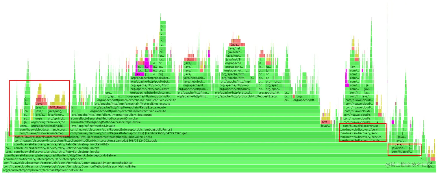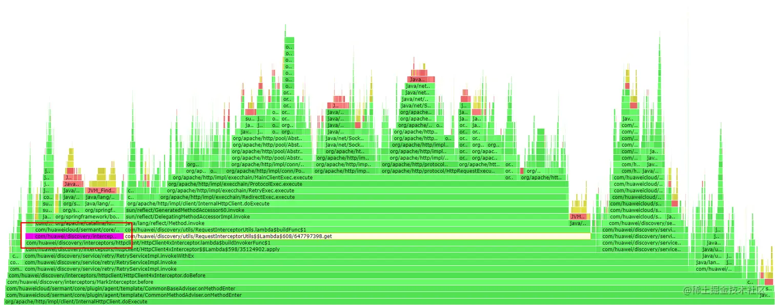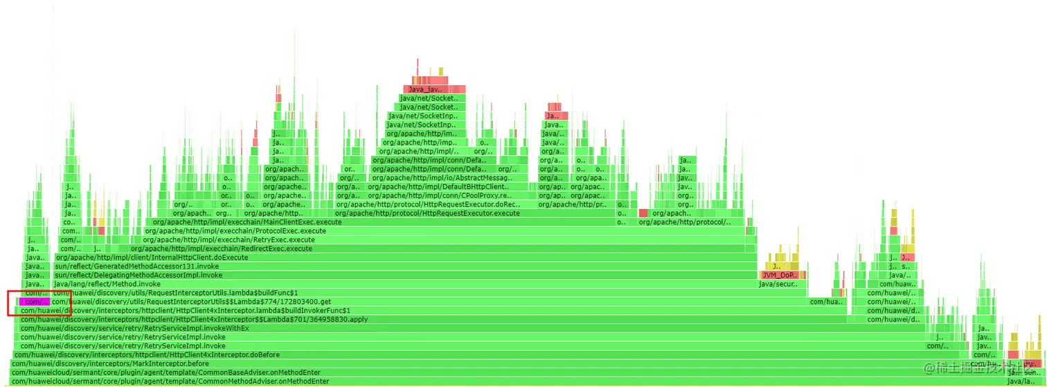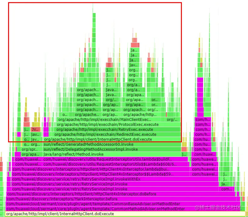在分析过程中,首先需要找到字节码增强时选中的被增强方法(本文场景增强方法为InternalHttpClient::doExecute),字节码增强需要被增强程序的原有方法调用触发,所以也可以很清晰的在CPU火焰图中可以看到,Sermant实现的逻辑调用栈在被增强方法之上,在字节码增强逻辑执行结束后,被增强方法还会继续执行。