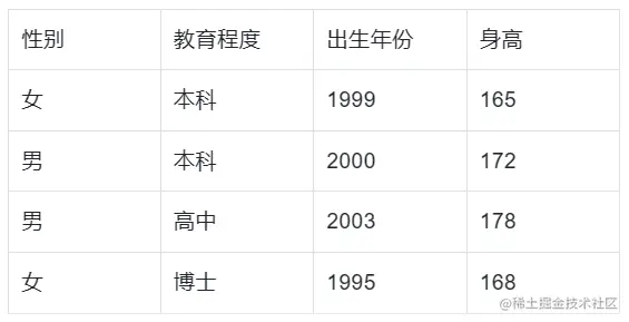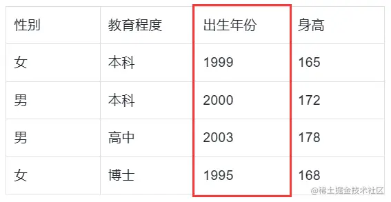 上面的表格中就含有性别、教育程度、出生年份、身高四个变量