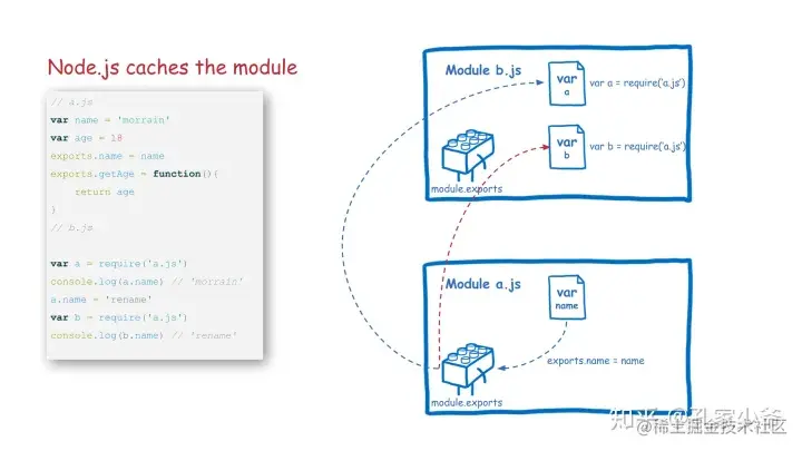 第一次加载某个模块时,Node.js 会缓存该模块。以后再加载该模块,就直接从缓存取出该模块的 module.exports 属性返回了。