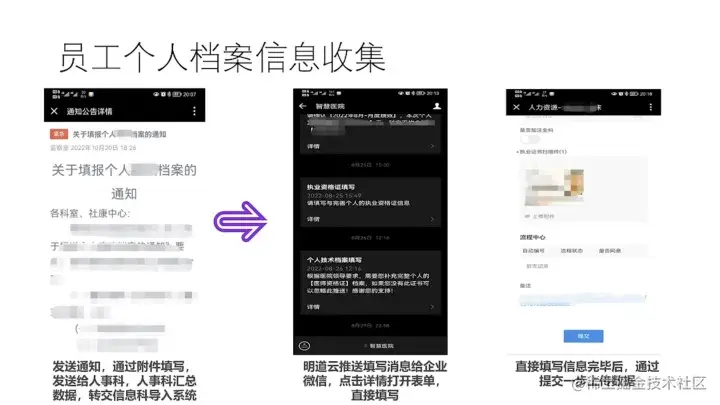 我们这次在上系统的时候刚好需要收集个人档案,像我们医生的档案比较多,一位医生的职业医师证、医师资格证等各种职称证,每个医生大概有几十个证书。以前我们授予证书的时候,都是向企业微信发一条通知,让医生登录到某一个系统,告诉他账号密码,怎么登录,效率非常差。我们上次做过统计,一天时间就收集了几十条,如果不强制收集,就很难完成,估计完成10%都不容易。