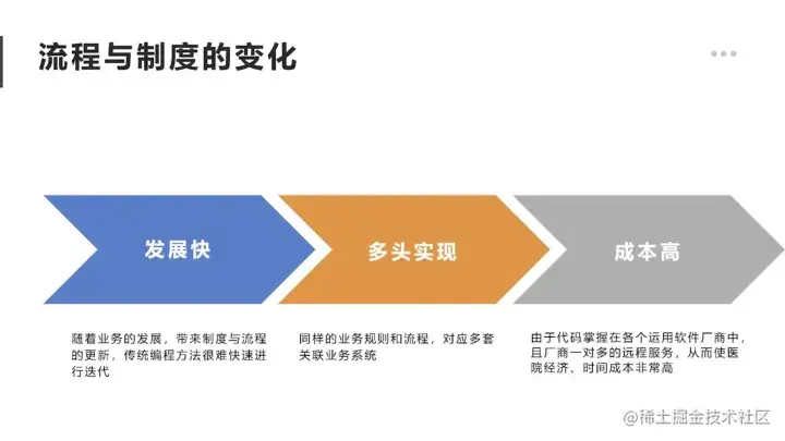 医院的发展还是比较迅速的,带来的是整个医院、科室的制度和流程都在不停地迭代。传统软件开发方式,必须通过工程师去改代码,改代码的方式其实很难快速地迭代。有些情况下,工程师还不一定有时间在现场。