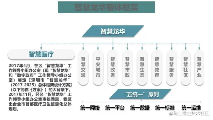首先,给大家介绍一下龙华区医疗信息化建设的情况,龙华区位于深圳市的中部,目前下属3家公立医院,2家公共卫生机构。2017年,龙华区提出了建设智慧龙华总体框架方案,龙华区卫生健康局也提出了建设智慧医疗114工程的整体思路。整个114工程坚持“五统一”的原则,即基于统一网络、统一平台、统一数据、统一标准、统一运维。