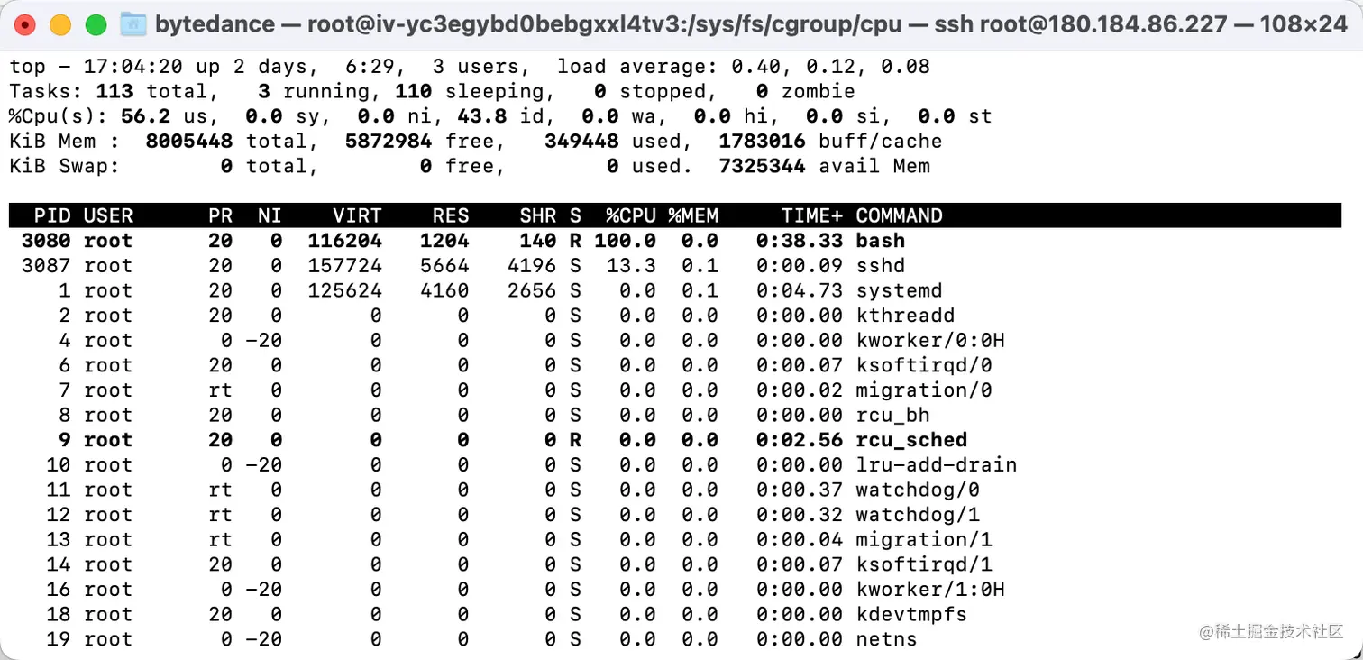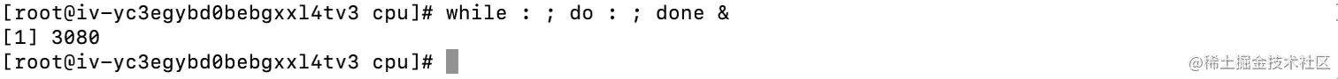 下面我们执行一个死循环脚本,让他把CPU资源吃到100%,根据输出,我们可以看到这个脚本的PID是3080。