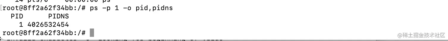 可以在容器内通过ps -p 1 -o pid,pidns查看该进程的namespace。