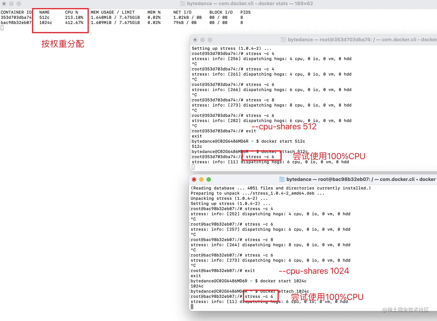 先执行 docker run -t -i --cpu-shares 1024 --name 1024c ubuntu:18.04 /bin/bash 再打开一个窗口执行 docker run -t -i --cpu-shares 512 --name 1024c ubuntu:18.04 /bin/bash 进入容器分别都执行 stress -c 6(stress是一个linux下的压力测试工具) 在打开一个窗口执行 docker stats 可以查看容器情况