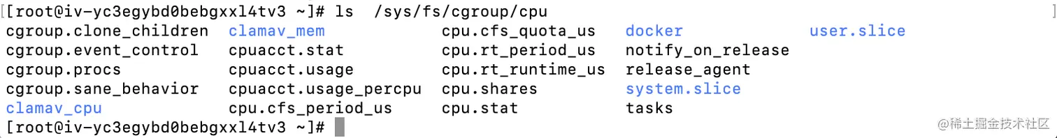 可以看到在/sys/fs/cgroup下面有cpu、memory、blkio等这样的子目录,这都是能被Cgroup进行资源限制的资源类型,而这些子目录下就是这些类型的限制方法,例如:对CPU子目录来说,我们可以看到如下几个配置文件。