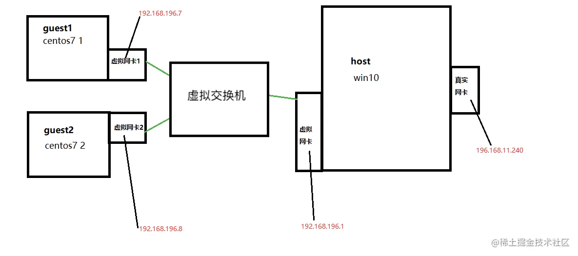 | Host-Only 仅主机 | 在Host上虚拟出来一个交换机,让各个Guest都连接到这同一个交换机。为了让Host也能和虚拟机通信,还需要在Host上虚拟出一块网卡,该虚拟网卡也要连接到之前虚拟的交换机上。仅虚拟机之间进行通信,及虚拟机和本机通信,与外部网络隔离。 | |