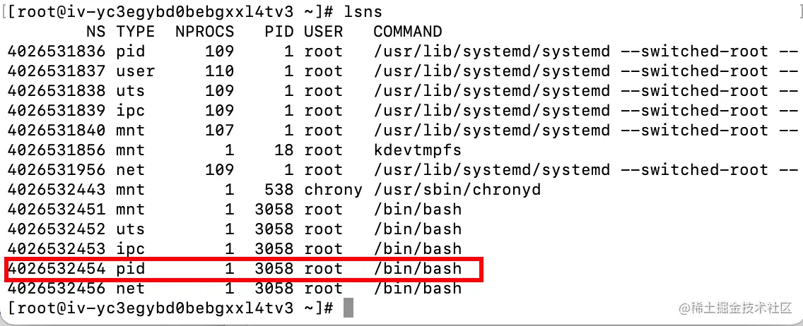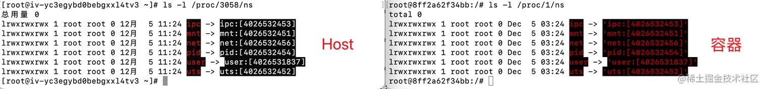 可以看到,namespace为4026532454的空间下的init进程实际上在Host当中的pid为3058。分别在Host和容器中通过pid查看该容器init进程所属的所有namespace,可以看到都属于同一个namespace下。