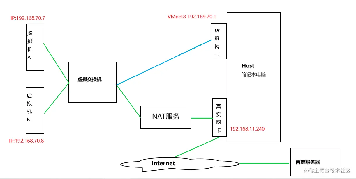 | NAT网络 | Host虚拟出一个NAT服务,虚拟机的源IP地址(也就是虚拟机的网卡地址)经NAT服务修改为物理网卡地址,再将数据发送出去。目的端无法得知真正的虚拟机的IP。 |