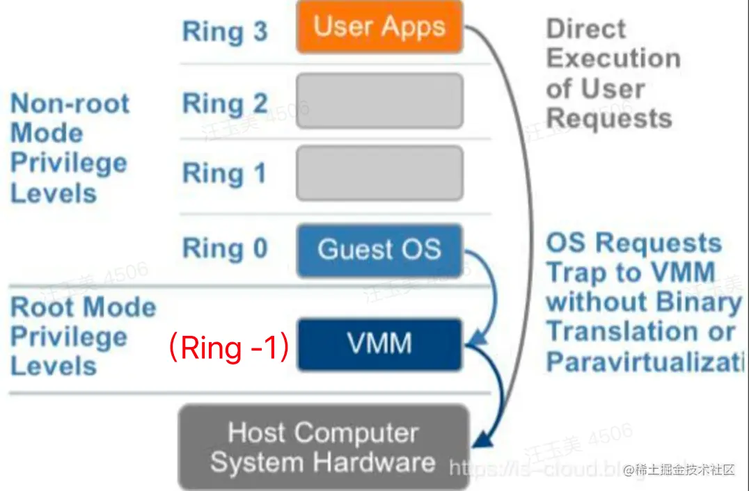 - 多个OS无法同时直接运行于硬件层之上,它们必须运行在Hypervisor层(下文称:Host)上,那问题来了,若GuestOS必须运行在CPU的Ring0上,Host运行在哪里?