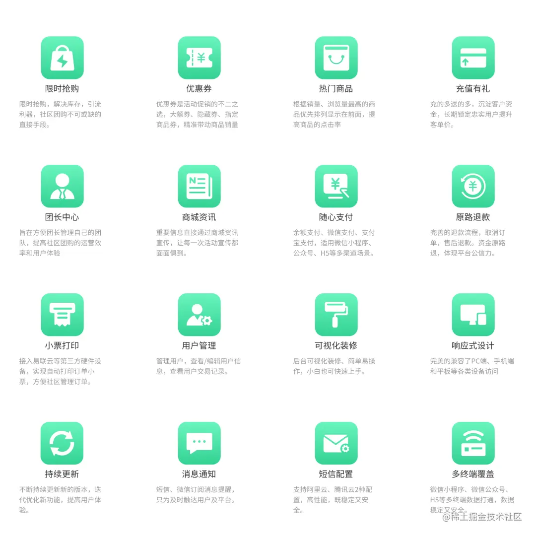 社区采购系统具有完整的电商功能,包括商品管理、订单管理、支付管理等,能够满足用户各种购物需求。特别是系统的“限时抢购”功能和“优惠券营销”功能,能够为用户提供更加实惠的购物体验。