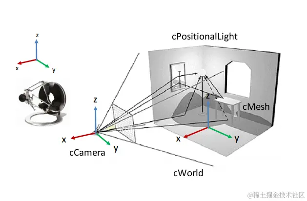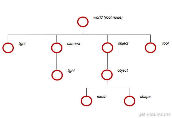 每个节点的位置在其父节点定义的坐标系中指定。节点还将其他属性应用于其内容及其后代的内容。例如,当节点旋转时,其所有后代也会旋转。您可以使用节点树构建复杂的模型,然后通过调整最顶层节点的属性来旋转、转换和缩放整个模型。