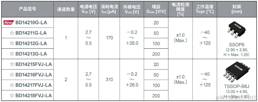 包括已开始量产的“BD14210G-LA”在内,ROHM计划逐步推进共8款新产品投入量产。产品阵容中包括2种通道数(1ch、2ch)和4种增益(20、50、100、200V/V)的产品。