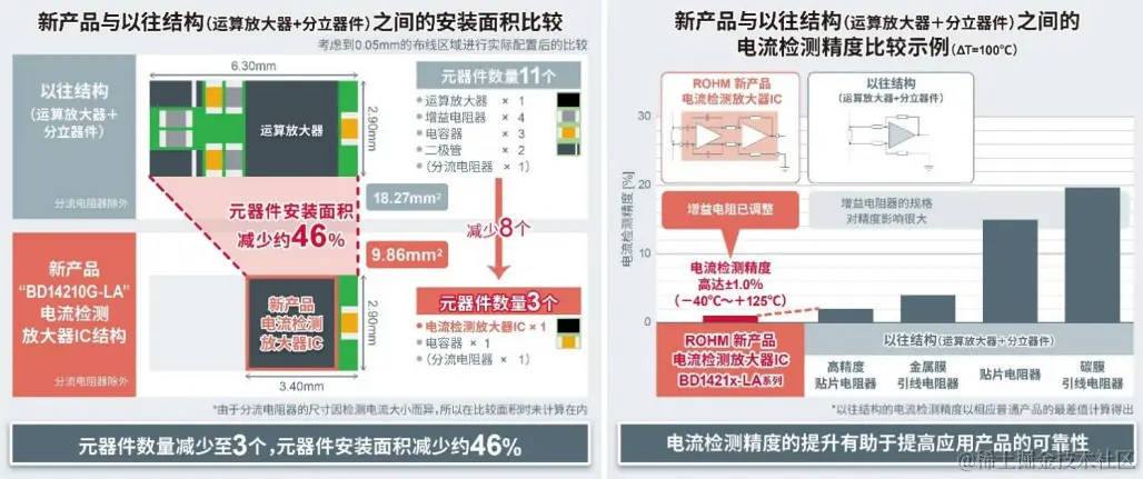 近年来,越来越多的应用产品需要具备电流检测功能。例如,要想改善电机效率和实现异常检测等目标,就需要提高电流检测精度。另外,还需要减少安装面积。在以往结构(运算放大器+分立器件)中,存在元器件精度波动和温度特性导致电流检测精度下降、很难缩小安装面积等问题。为了解决这些问题,ROHM利用长年积累的模拟技术优势,开发出更节省空间且能高精度检测电流的新产品“BD1421x-LA系列”。