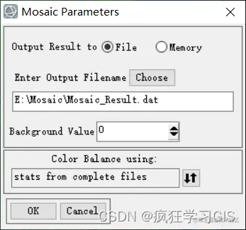 在弹出的窗口中,配置镶嵌后图像的保存路径与名称,并将“Color Balance using:”一项选择为“stats from complete files”即可。