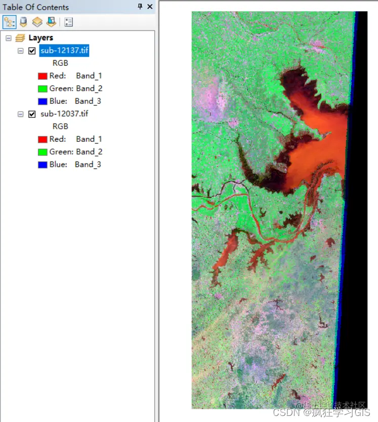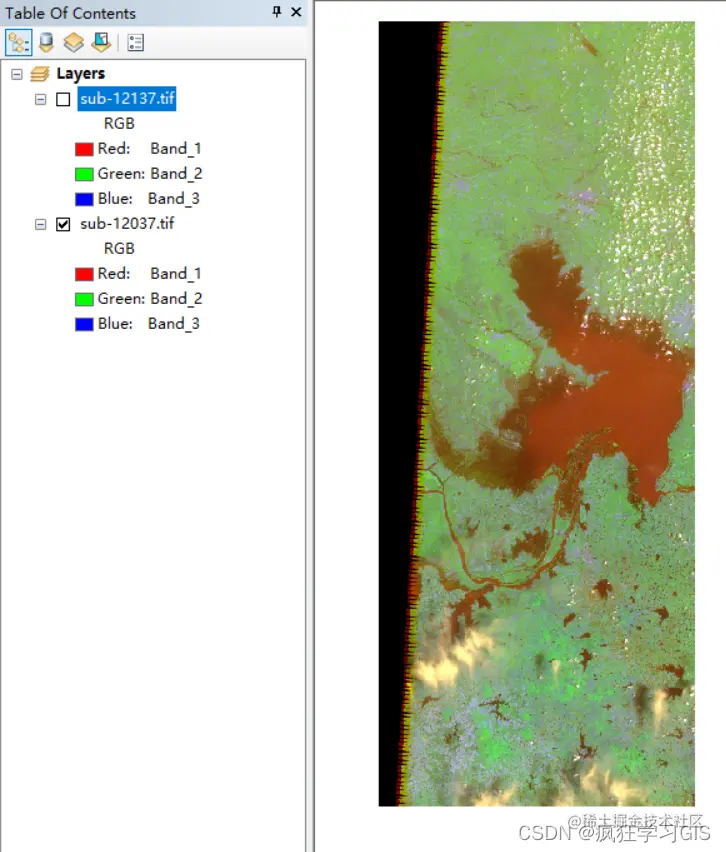 我们先来看一下本文需要实现的需求。现有以下两景遥感影像,在ArcMap软件中打开,其中一景如下图所示。