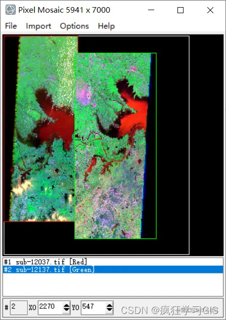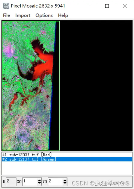 可以看到,此时两景影像依然是重叠在一起的,且不能拖动;而我们在后期对这两景遥感影像进行镶嵌时,肯定首先需要调整二者的位置。那么,我们就需要对刚刚提到的镶嵌范围进行扩大,从而让我们可以拖动两景遥感影像。