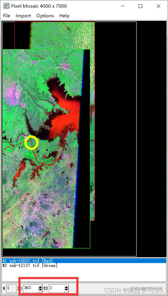 当然,这里还有一个找到不同遥感影像之间相对位置的办法。我们可以首先选定一个每一景遥感影像中都含有的地物标志像素,例如下图中黄色圆圈内的河流交界处的像元;随后,在ENVI软件中通过Crosshairs功能、Cursor Value功能确定该像元在每一景遥感影像中的像元位置(X与Y位置);接下来,对两景遥感影像的X位置与Y位置依次做差,并依据差值修改下图红色方框内的图像左上角点的像元位置,就可以快速确定两景遥感影像之间的相对位置。