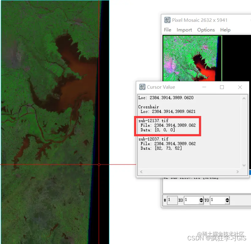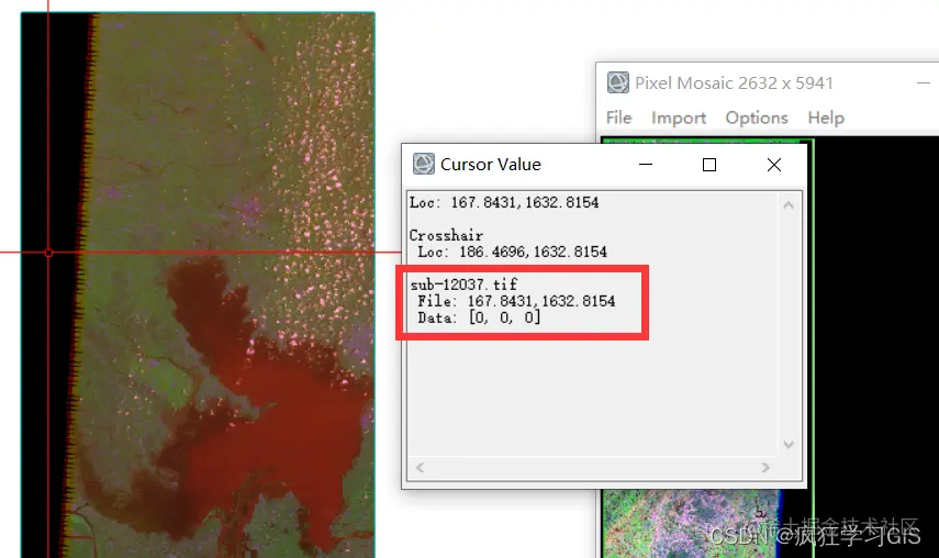 确定了遥感影像之间的相对位置后,我们还需要分别查看每一景遥感影像背景值(NoData值)处像元的数值,为了后期的镶嵌做准备。这里我们依然通过Crosshairs功能、Cursor Value功能实现即可。