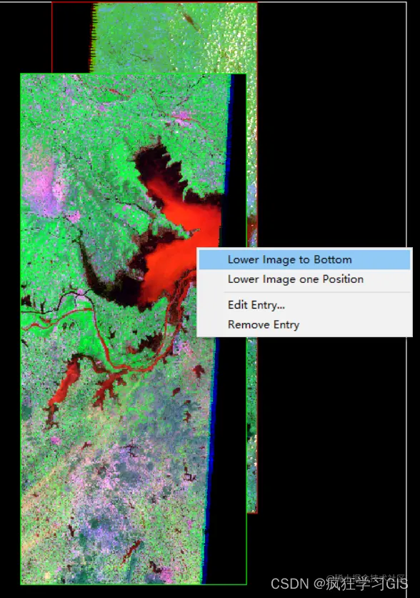 接下来,不断拖动遥感影像,使其二者处于正确的空间位置。用“Pixel Based Mosaicking”工具镶嵌不含有地理参考信息的栅格图像时,有一个比较麻烦的地方——其不能调整每一景遥感影像的透明度;这就会导致我们在拖动两景遥感影像时,会稍微有些不方便确认二者是否完全匹配到合适的位置。我们只能在图像上右键,通过如下图所示的选项不断切换两景遥感影像之间的显示优先级,从而大致判断图像是否处于合适的位置。