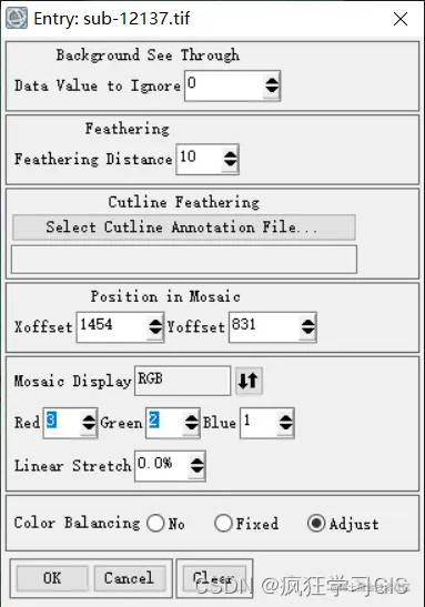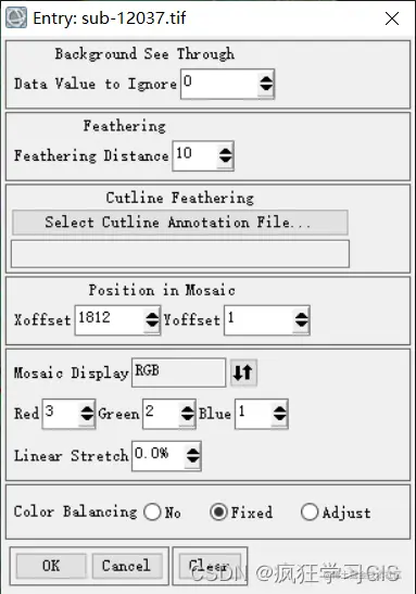 在弹出的窗口中,第一项输入我们刚刚获取的遥感影像的背景值,第二项选择图像接边线的羽化范围;随后,配置图像显示的RGB通道与拉伸比率,并对图像的颜色均衡进行调整。对于颜色均衡,我们只需要对待镶嵌图像中的任意一景的“Color Balancing”选择“Fixed”即可,其它图像均选择“Adjust”。