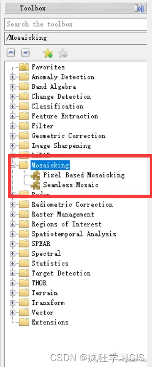 接下来,在ENVI的工具箱中,依次选择“Mosaicking”→“Pixel Based Mosaicking”。
