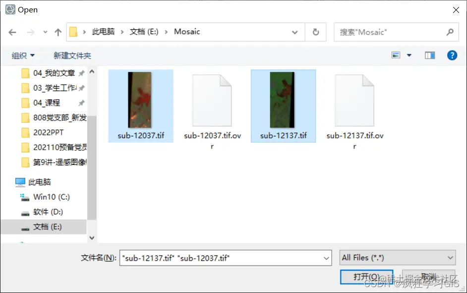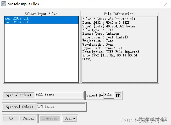 在弹出的文件选择窗口中,选中我们需要进行镶嵌的两景遥感影像文件,并选择“打开”。