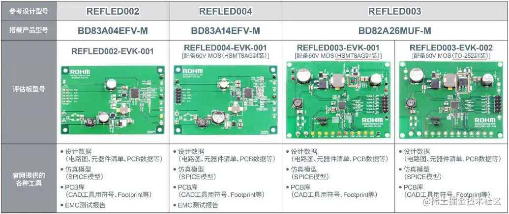 ROHM的官网上公布了装有此次开发的新产品的四种参考设计(REFLED002、REFLED004、REFLED003)(参照下表)。这些参考设计已经通过了标准的电气特性测试、EMC测试以及热特性测试等各项测试,非常适用于车载显示器液晶背光驱动电路的设计探讨。除了评估板外,ROHM官网还同时公布了设计数据、搭载产品的SPICE模型、CAD的PCB常用符号等各种工具。通过使用参考板,能够简化在实际应用产品中的相关探讨工作。