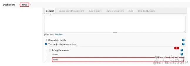 在 Jenkins 上创建 tmp job 并加入参数 name :