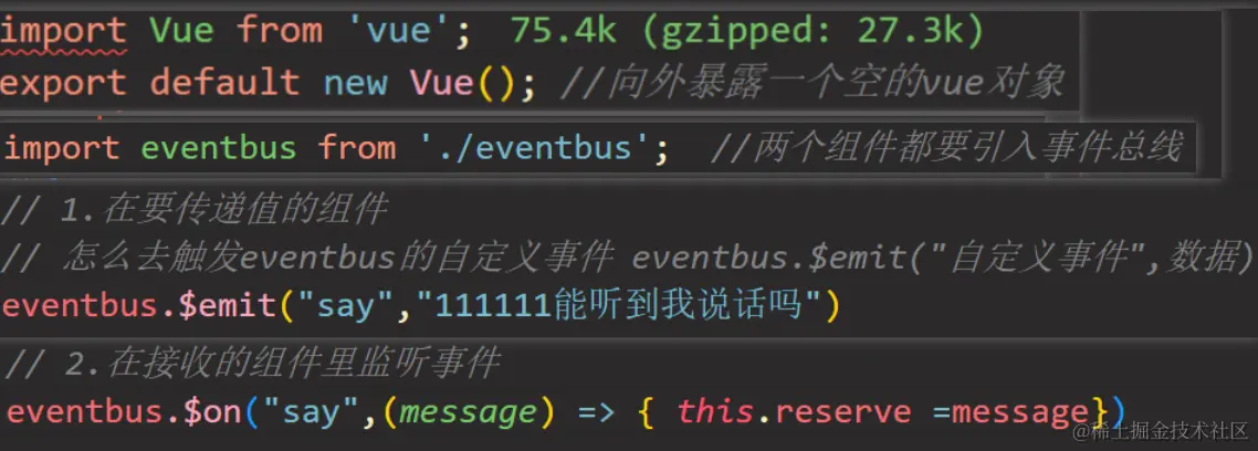 核心语法: EventBus/index.js- 定义事件总线bus对象 import Vue from 'vue' // 导出空白vue对象 export default new Vue()