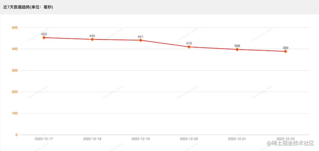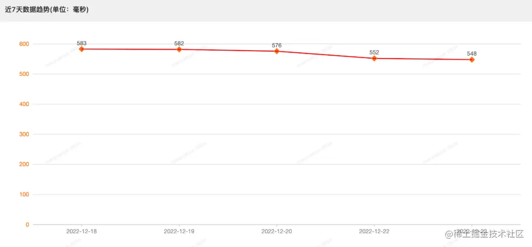 目前除了上面商品详情页的监控指标,我们还对工单详情页面和订单详情页面的渲染时间以及消息接收和发送的耗时做了监控,当超过一定的阈值,就会上报告警信息。目前工单详情和订单详情页面经过多次的重构,整体的渲染耗时已经稳定在 500 毫秒左右,做到了秒开,具体可以看近一周的渲染趋势:近 7 天工单详情页面渲染趋势: