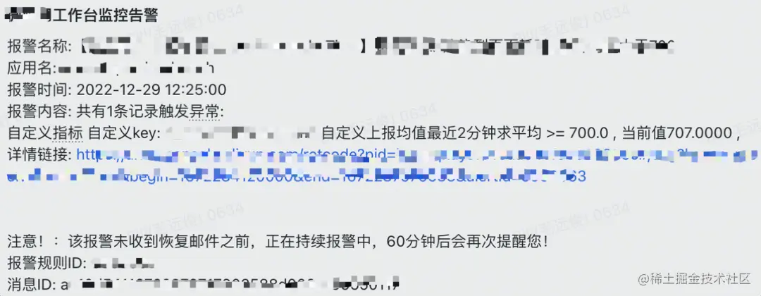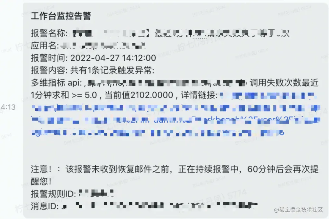 接入监控以来,通过双周稳定性周会的治理,归因于前端的 TS 问题数量不断的减少,在双十一和双十二大促期间,也持续的稳定在 5 个以下 。## 4.2 潜在问题的发现通过监控告警至少发现潜在的问题不少于 5 处 ,通过告警信息及时解决了潜在问题的风险,避免了线上问题的发生。这里举一个非常典型的接口超时告警的例子:获取用户标签信息接口超时告警