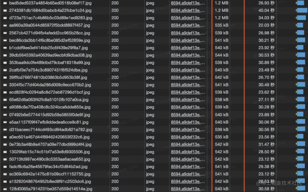 经过三天的线上数据分析发现,大部分耗时在加载图片耗时上。分析耗时较长的商品详情上下链路,发现此类商品的图片大多为 500kb+甚至 1MB 左右的图片 ,单个商品最多的情况下商品轮播图近 52 张图,加上商品细节图、商品穿搭效果图等,单个商品详情页面首次打开竟然需要加载 80+张图片,对于浏览器而言是灾难性的。
