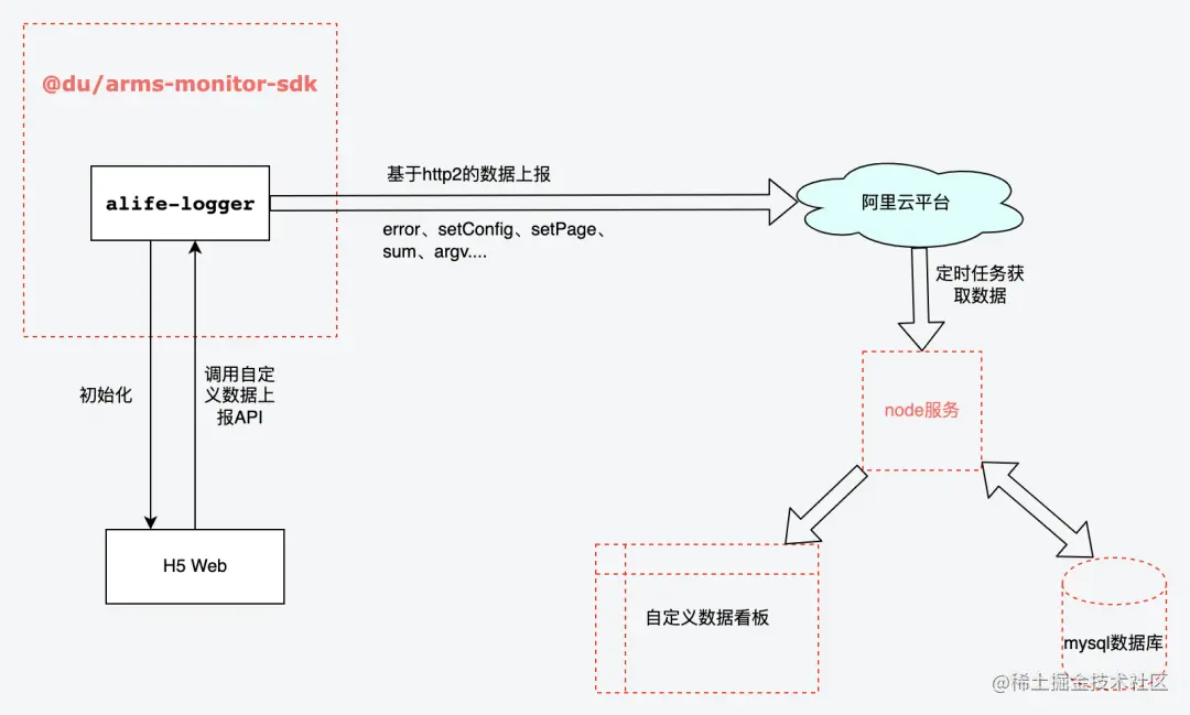 Arms 提供的 SDK 功能比较齐全,为满足一些定制化的数据上报诉求、应用数据权限管控以及控制上报成本,客服域接入时基于 alife-logger 进行了二次封装,对功能更加的可控, 同时定期从阿里云平台进行数据初始化和生成定制化报表。
