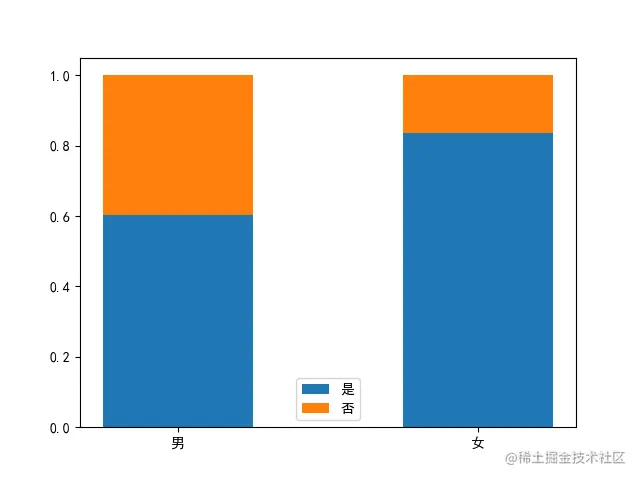 除了表的形式,我们还可以选择图表的形式探索两个变量间的关系,适用于呈现两个分类变量的关系的第一个图形就是分段条形图