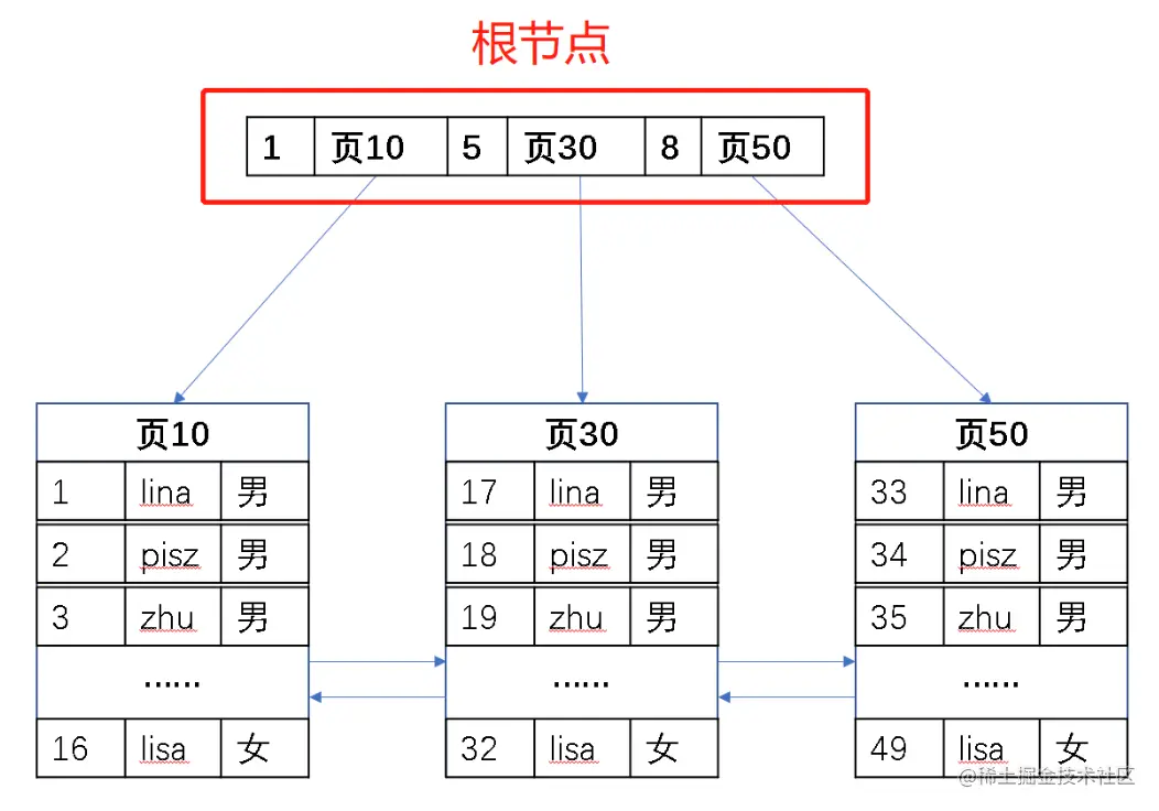 第二层节点作为叶子节点,存放的是大小为16kb的页数据,页数据里每一行记录大小为1kb,那么,一个叶子节点的页里就可以存放16条数据。
