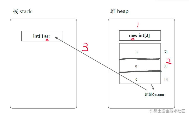 数组本质上是一种对象,当我们new一个数组的时候,会在堆中开辟一个相应的空间,然后将此空间的地址赋给栈中的arr这个变量,arr这个变量就是这个数组的引用。