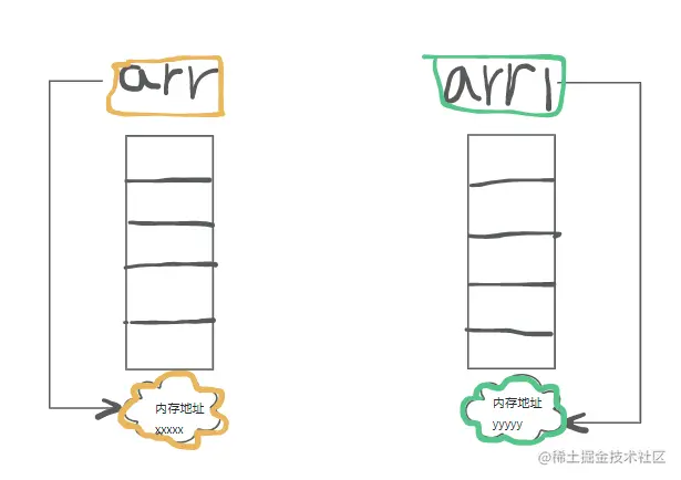 同理,当有两个不同数组的时候,它们的变量名指向的是各自的数组空间地址: