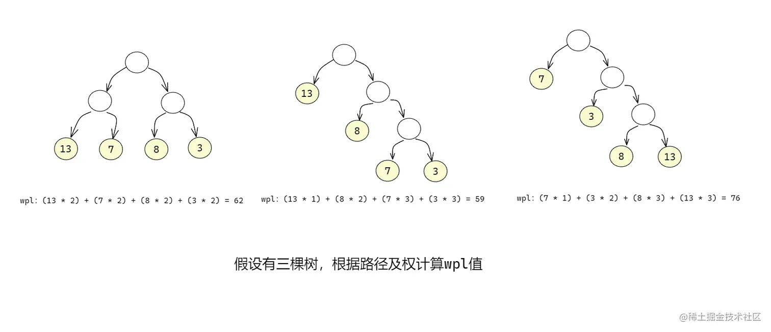 - 树的带权路径长度:树的带权路径长度规定为所有叶子结点的带权路径长度之和,记为 WPL(weighted pathlength) ,权值越大的结点离根结点越近的二叉树才是最优二叉树。