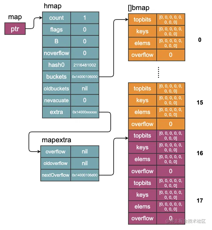 以上字段中,含义我们都可以按照注释理解,我们需要着重关注buckets、oldbuckets和extra几个字段。bucket就是我们常说的”桶“,一个桶中最多装8个key-value对,我们也可以理解为8个槽。