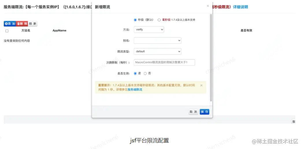 除了对请求鉴权外,在实际的生产中,还可以对请求容量进行限制,对请求容量进行限制时,可以按QPS进行限制,也可以对每天的最大请求次数进行限制。在jsf平台管理端,可以对具体的方法进行请求的QPS限流。