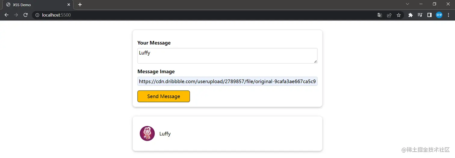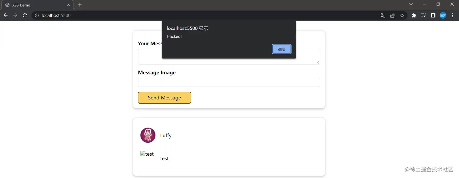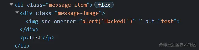 因为源码已经给出来了,所以可以判断出在 Message Image 处,我们能够注入恶意脚本